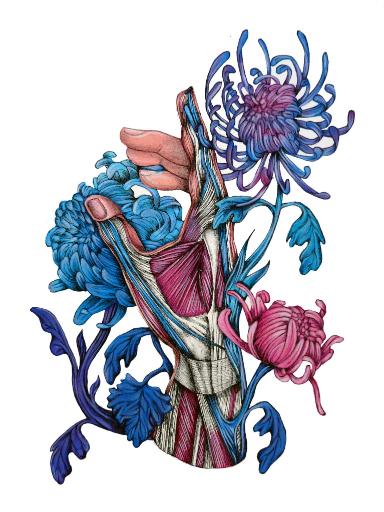 L’anatomia umana è in mutazione: gli inchiostri sono liquidi di contrasto che individuano vene, tendini e fibre muscolari per farne un fascio di gigli, dalie, rovi. Vi si appollaia un visitatore, ma è solo un testimone. Affratellati sono l’uomo e la pianta; l’animale suggella l’unione con la calma distratta che appartiene alle cose che sono destinate ad essere.