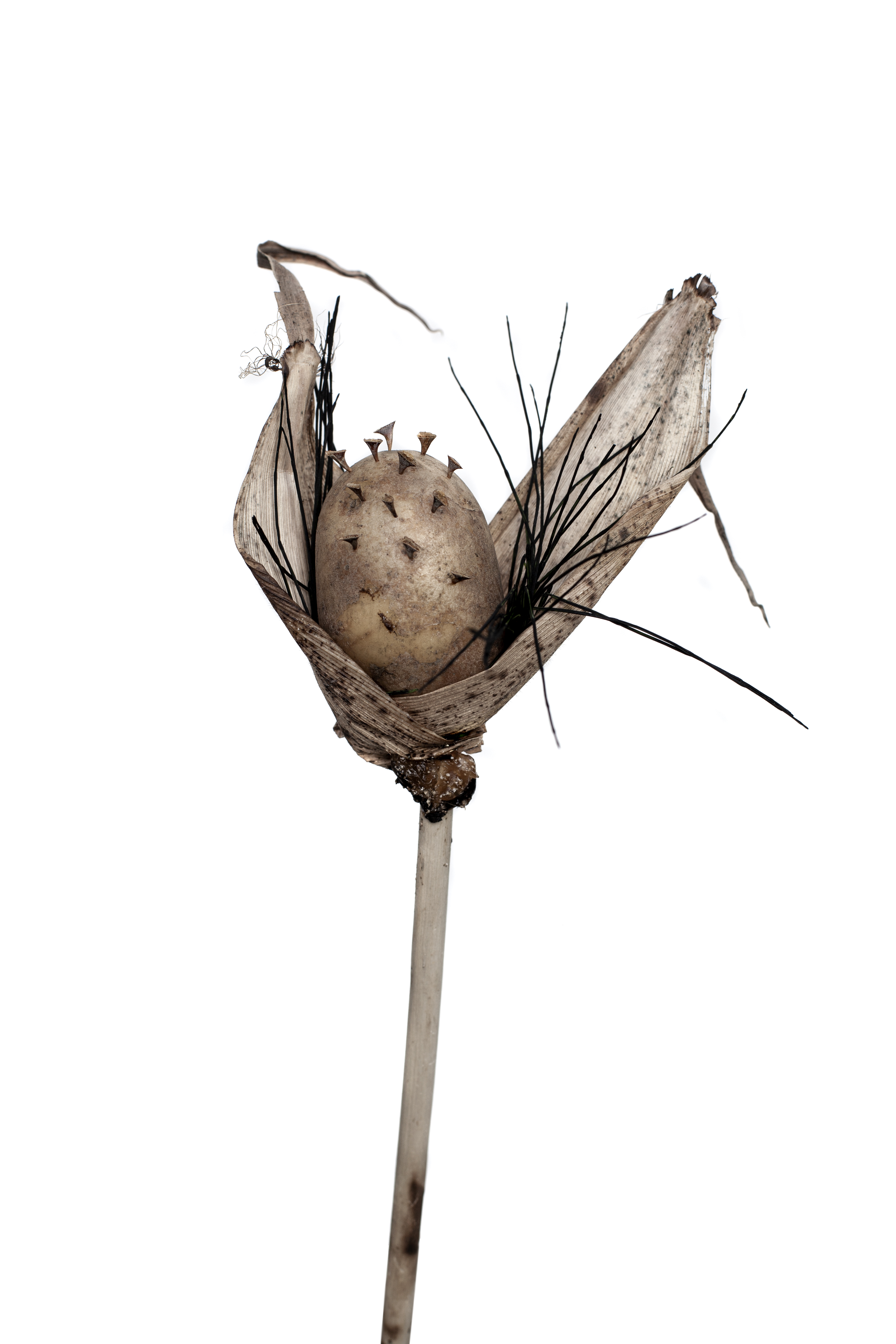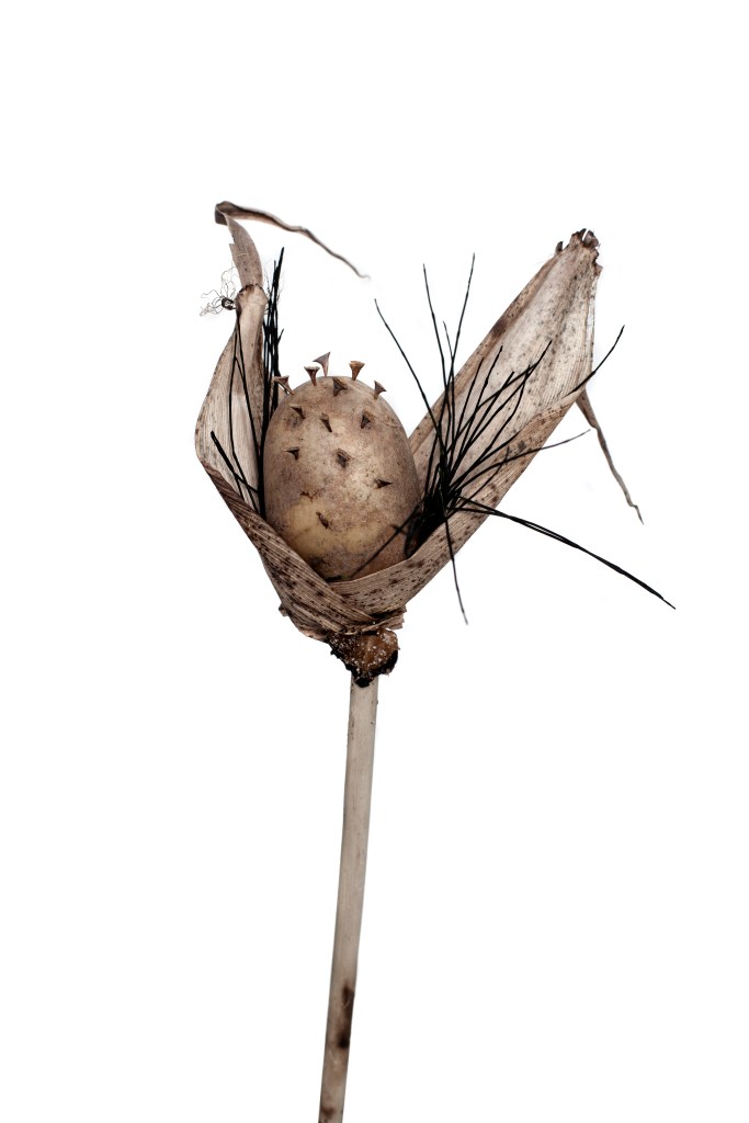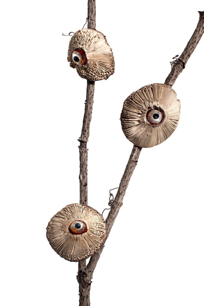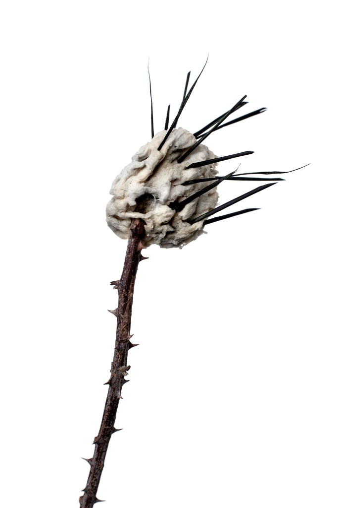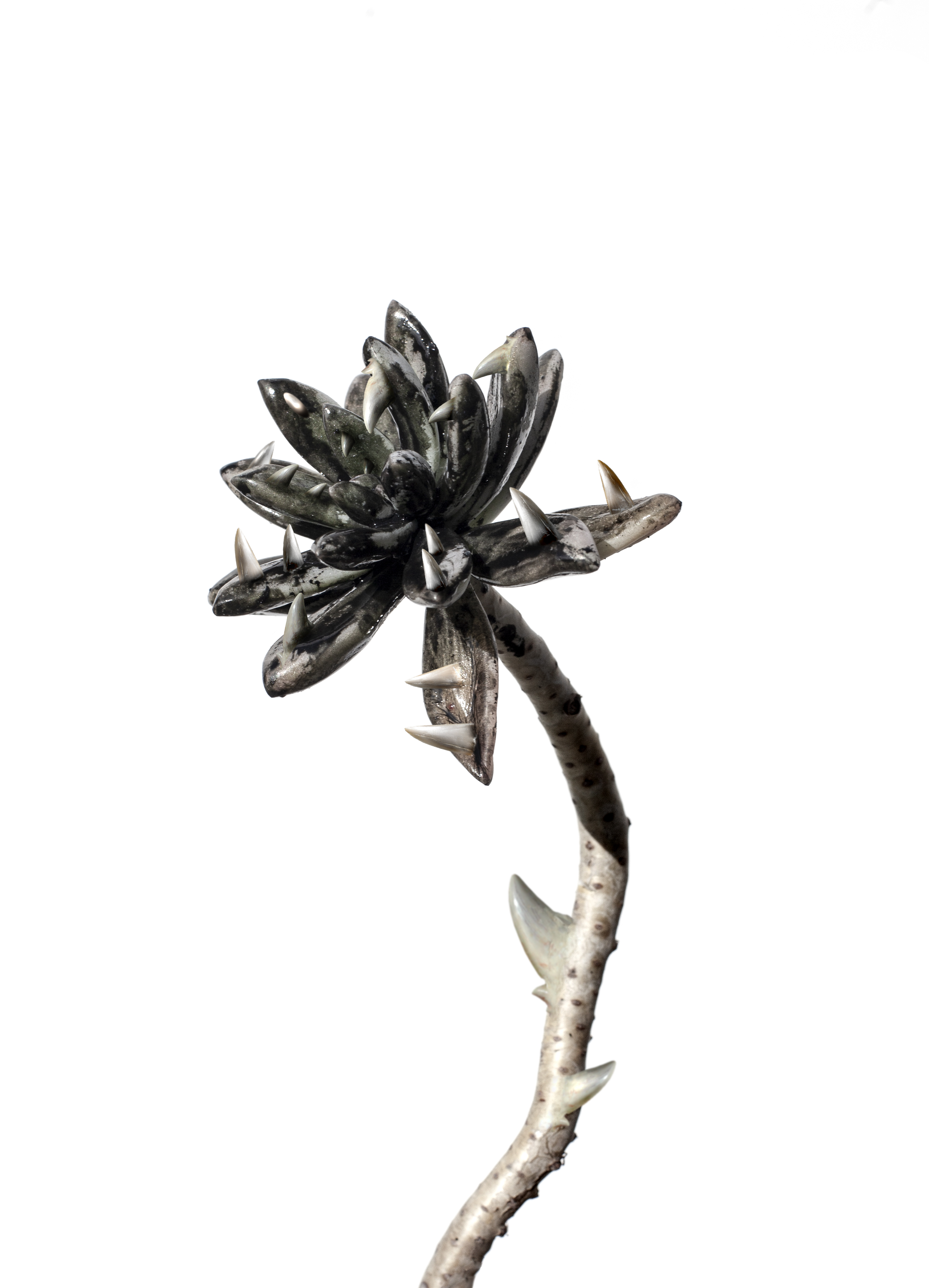 Denti, zanne e occhi sono il corredo offerto da questa flora post-apocalittica in luogo di petali setosi e steli delicati; non ci sono dubbi sul fatto che sappia come difendersi dai predatori. Malgrado la fragilità del fiore che china il capo al passaggio dell’aratro sembri appartenere a tutt’altro repertorio, non si può dimenticare che le armature si mettono a protezione di vulnerabilità potenzialmente fatali. L’erbario avanza dunque la sua sfida: riconoscere la bellezza trincerata per mutazione adattativa.