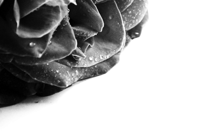 La ruvidezza della scaglia offre nel suo rovescio la seta del petalo. Nella seconda immagine il dolce abbandono orizzontale della rosa oppone alla forza dello stare quella del lasciare; e nel lasciare, l’accogliere ciò che si posa, come l’acqua in goccia.