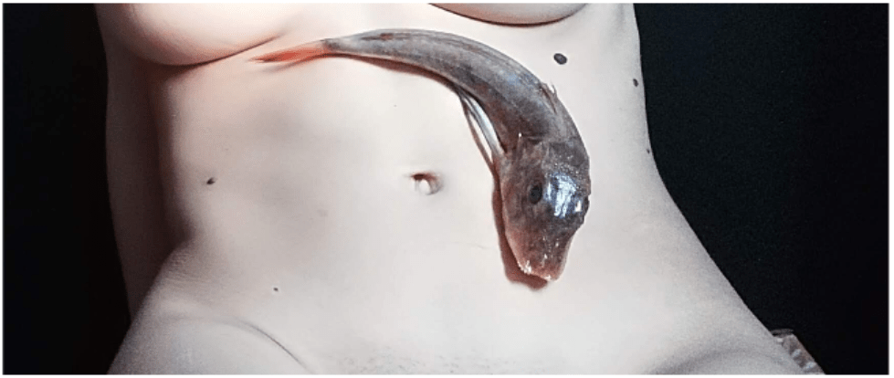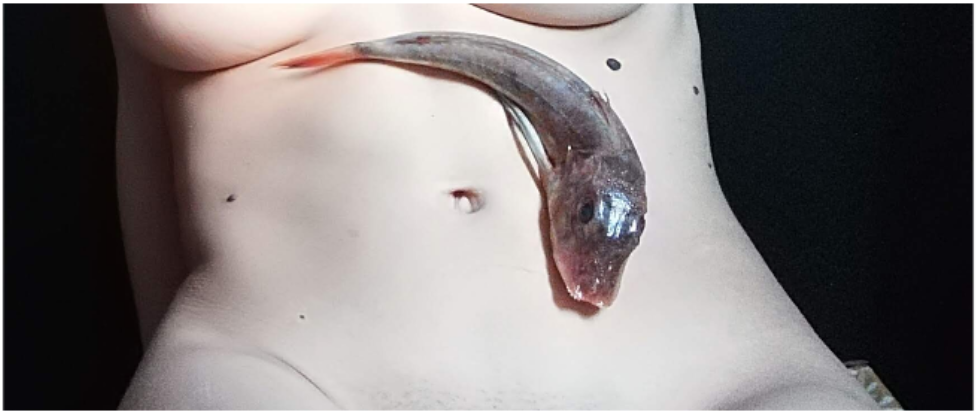La superficie di questi scatti ha la patina di un cammeo, le pose immobili da ritratti da camera conferiscono alle immagini un suono senza tempo, un lirismo da Belle Époque. Ma il corpo del pesce apparecchiato sulla pancia, le ali dell’assorbente sullo slip nero ricordano che la donna è un mostrum, un delicato passaggio mai del tutto compiuto tra regno umano e animale, e come tale va trattato.