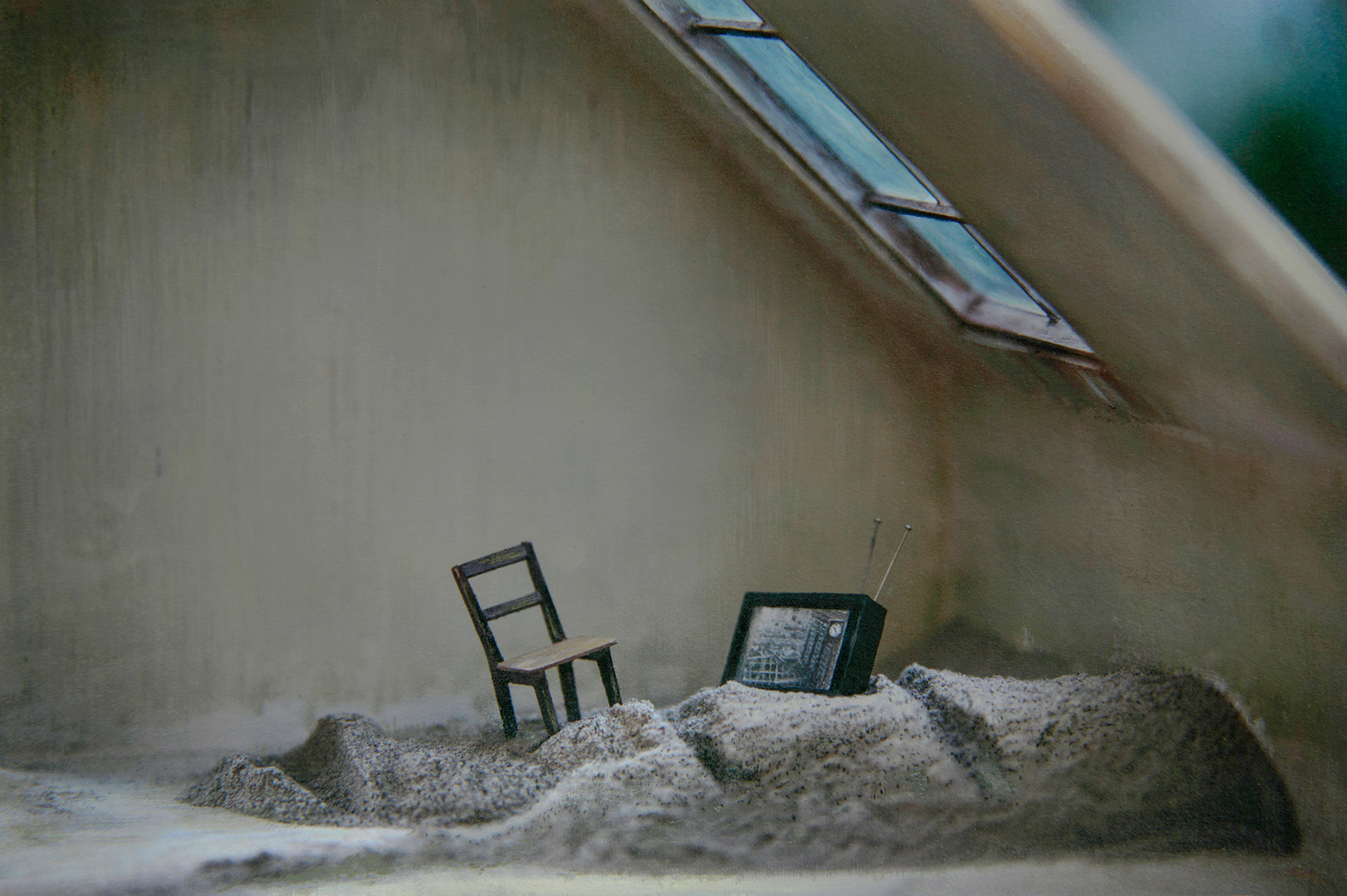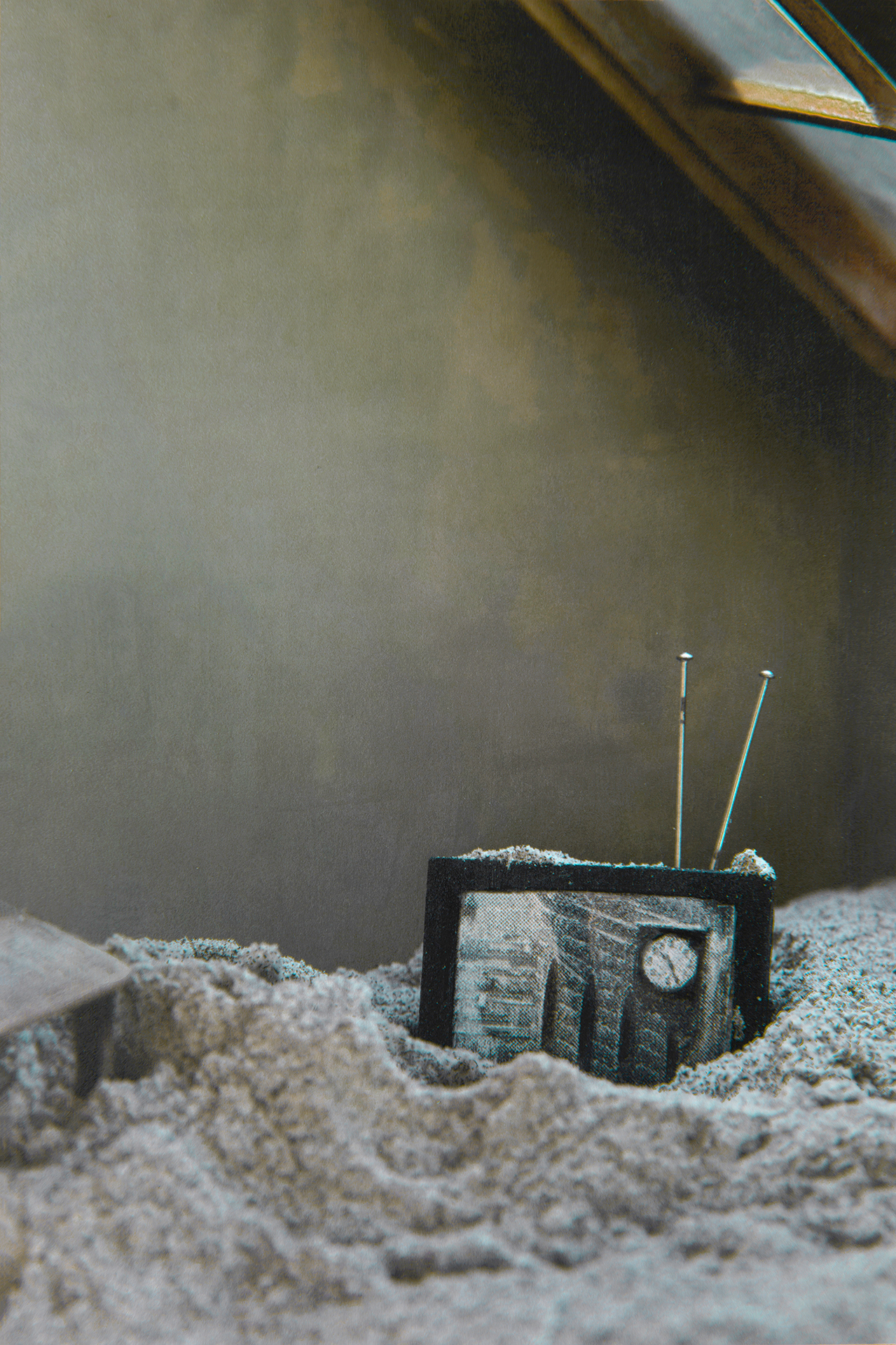 Through her gaze, the word turns into a poetic yet concrete space; space in which the characters of the tale, Ester Leo in this case, come alive. So, the story of a life widens, it fills with forgotten items, with waiting, with layers of memory that the artist melts into a pile of sand where a broken television, frozen on the same frame forever, floats; in a pomegranate; on a newspaper page.