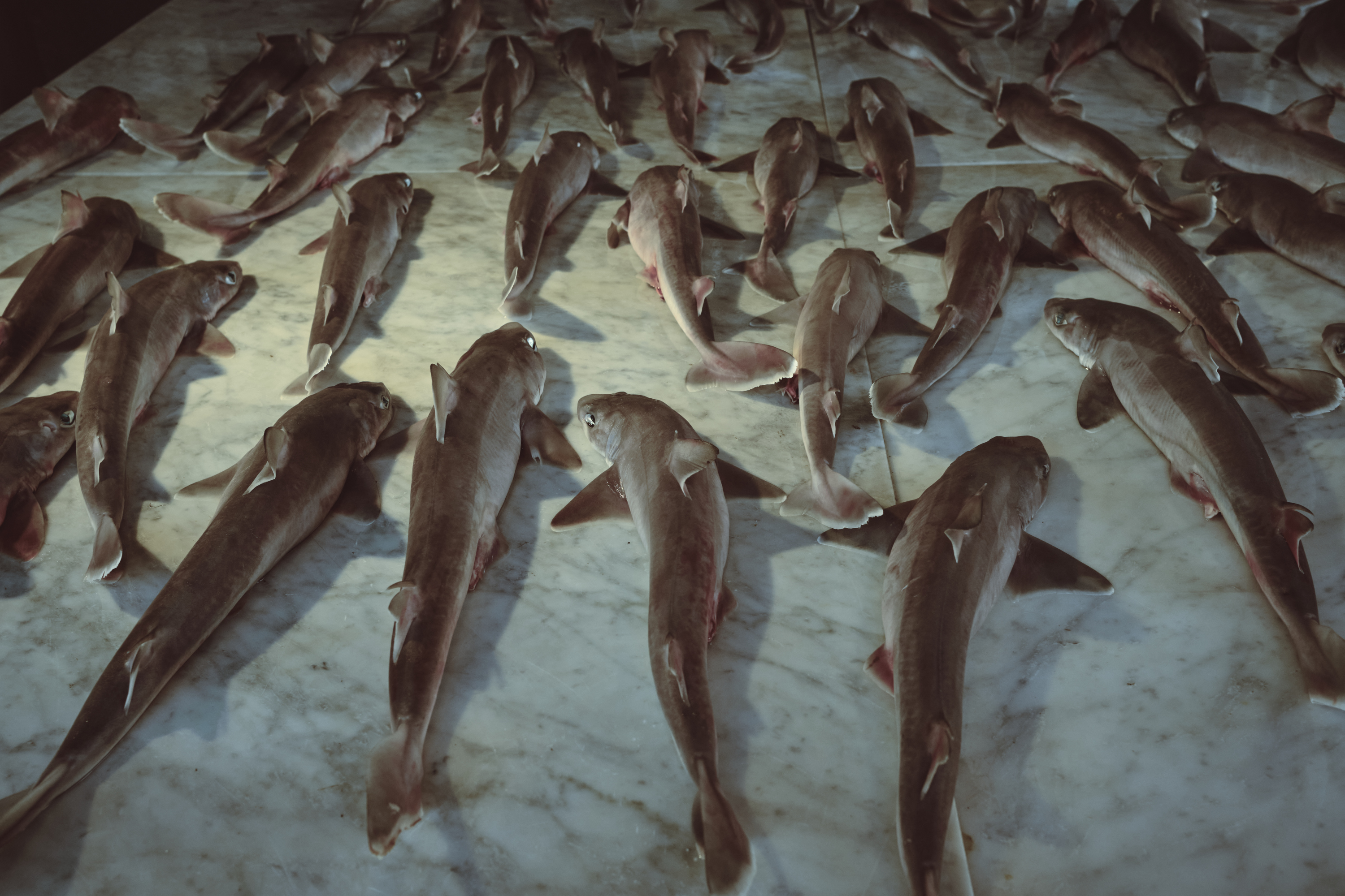 I corpi e i calchi, neri, sono disposti lungo le vie di fuga della prospettiva all’interno del mercato ittico. Posizionati sui banchi di marmo del pesce, non si muovono. Cercano di non muoversi. Dal telaio metallico scendono lampade al neon: assorbono l’ultimo fascio di luce del giorno che attraversa il vetrocemento. Da vicino i calchi in gesso si distinguono dai corpi viventi che simulano la morte. Da lontano no. Da lontano la morte appare come una massa nera indistinta. Da vicino assomiglia a chi la guarda. Da lontano la massa lascia sporgere le ossa appuntite dei gomiti. Da vicino anche le ossa si fanno più morbide. Sono passati millenni ma il tempo dal rigor mortis è dilatato. Le funzioni vitali non sono ancora cessate del tutto, come avrebbe invece voluto l’artista.
