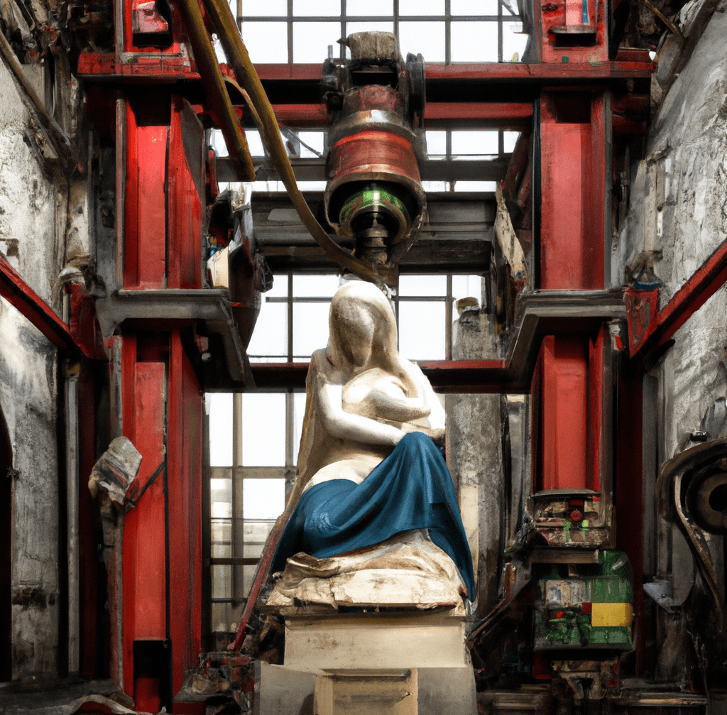 Alcune opere fotografiche di Tom Clerckx dalla serie IndustrialXMediterranean07 e, in basso, la Madonna con bambino sotto pressa idraulica (marmo e componenti industriali, collezione privata).