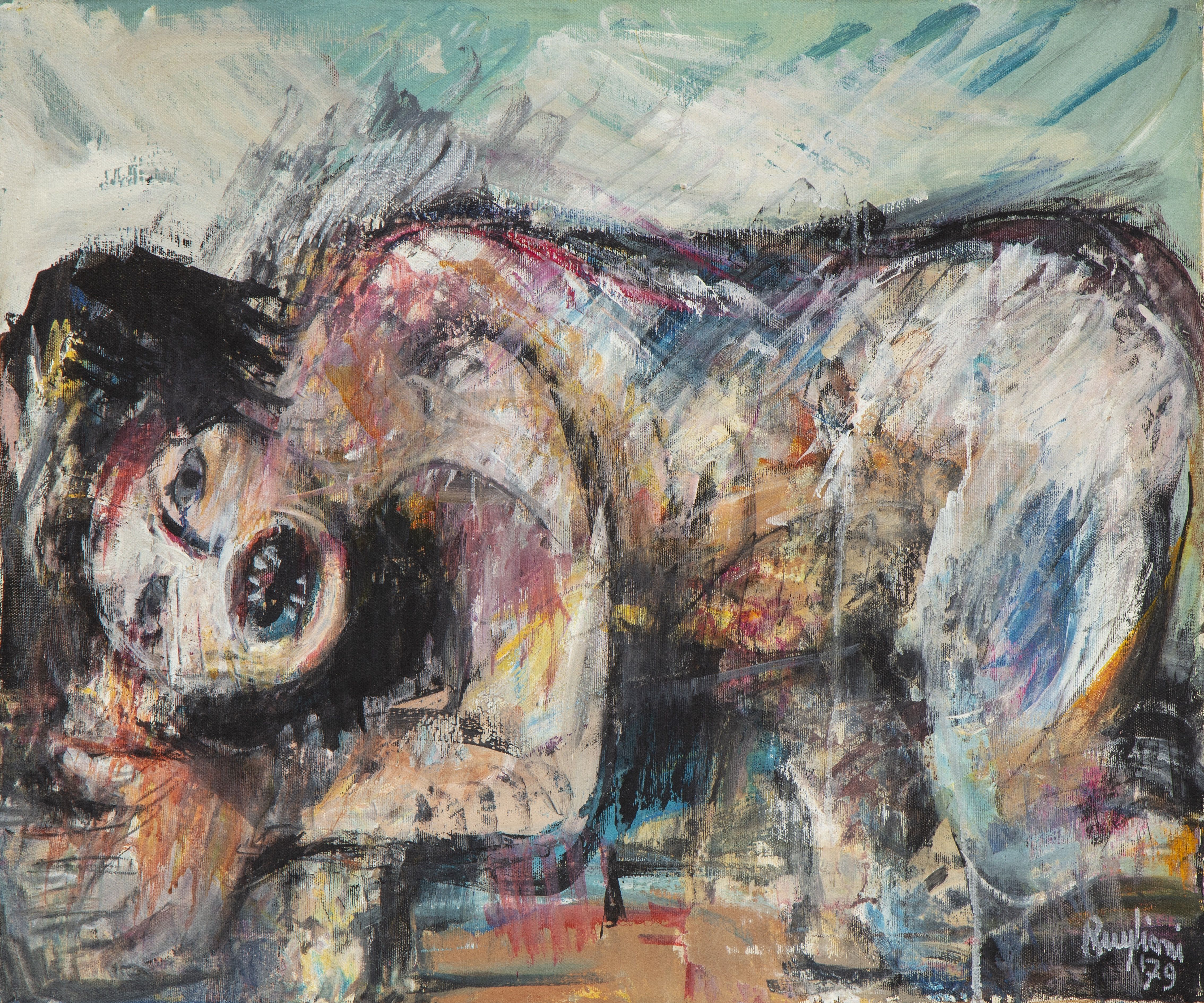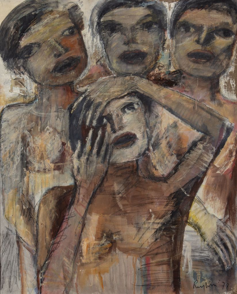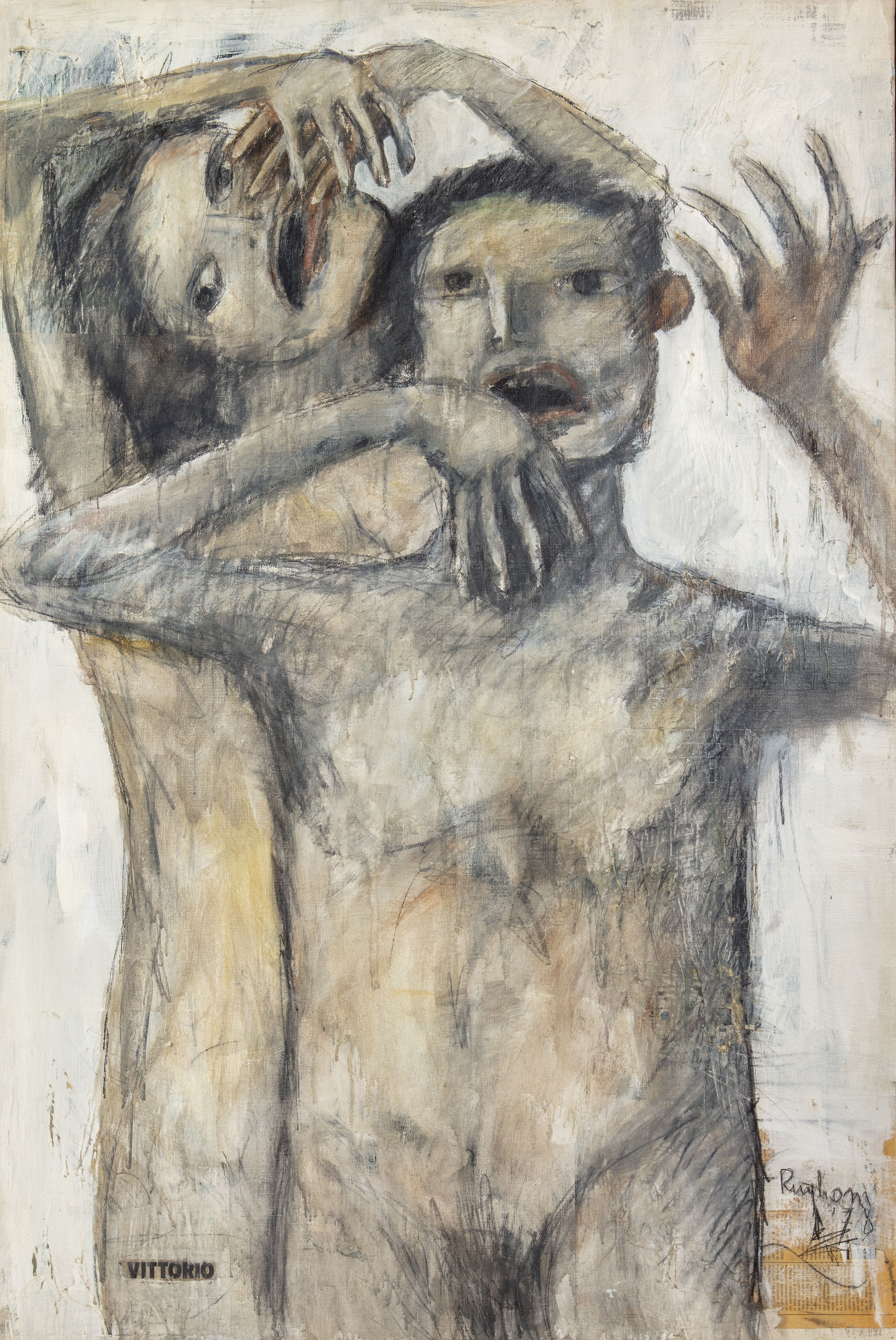 La visionarietà di questo artista è impressa tanto nel medium pittorico, quanto in quello poetico. La sua ricerca artistica è volta alla rappresentazione dell’umana vicenda esistenziale per accentuazione dei suoi aspetti drammatici, se non grotteschi, delle sue fragilità, come del suo sacrificio, per esposizione al violento divenire della realtà che passa irrimediabilmente per i corpi. Ruglioni ha amato esprimersi pittoricamente per serie e cicli come, ad esempio, Prigionieri, All’ombra delle fanciulle in fiore, Travestiti, Casse-pipe, nei quali i recuperi letterari, come quelli proustiani, pasoliniani e celiniani dialogano con le aspirazioni del suo campo stilistico. Vicino al movimento dei neo-figurativi, non smette mai di interrogarsi sulla forma, sul gesto artistico, sui limiti della dimensione rappresentativa, attraverso una oscura partecipazione emotiva che rende possibile una folgorante resa espressiva. Al centro, la figurazione umana, incisa, graffiata per impronte, ombre, calchi, come rimandi a una realtà altra rispetto a quella visibile, della quale nella pittura si conserva appena l’intelaiatura che già vacilla quando si leggono i titoli delle opere, come Rappresentazione, Recita, Teatro, Interrogatorio che rivelano la messa in scena delle vite nei suoi figuranti di cui Ruglioni riesce a catturare vuoti, paure, nevrosi, nostalgie, dolori, illusioni.