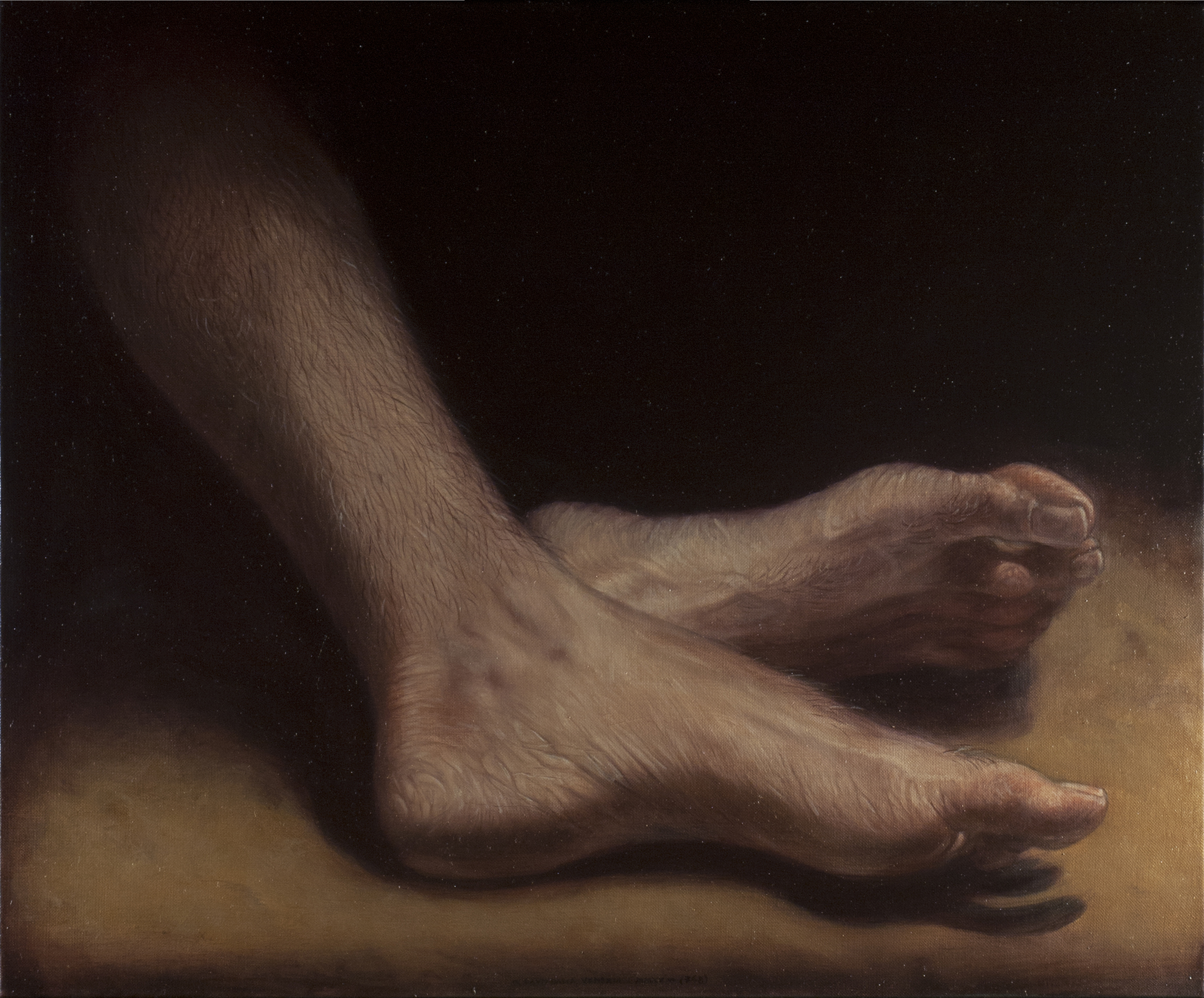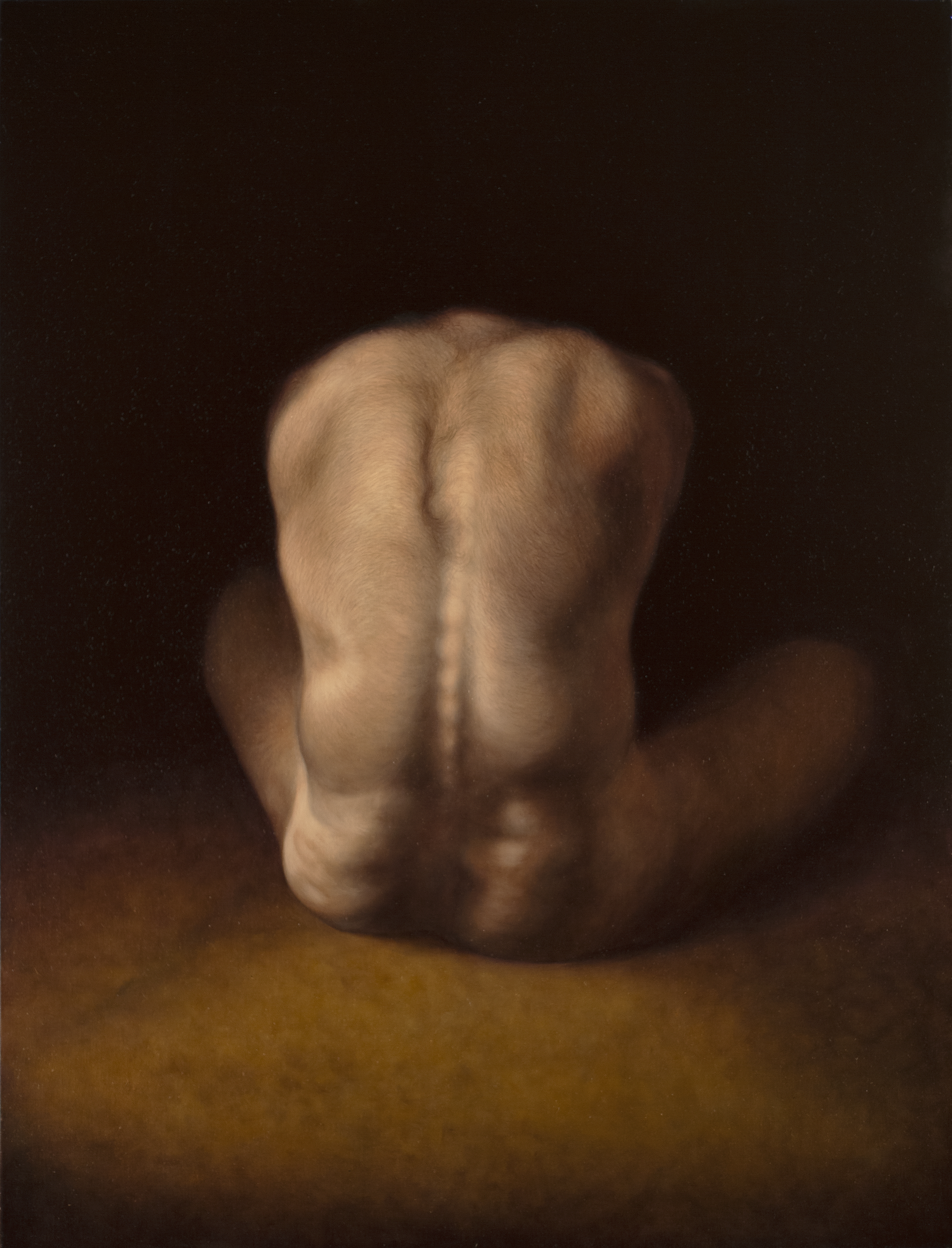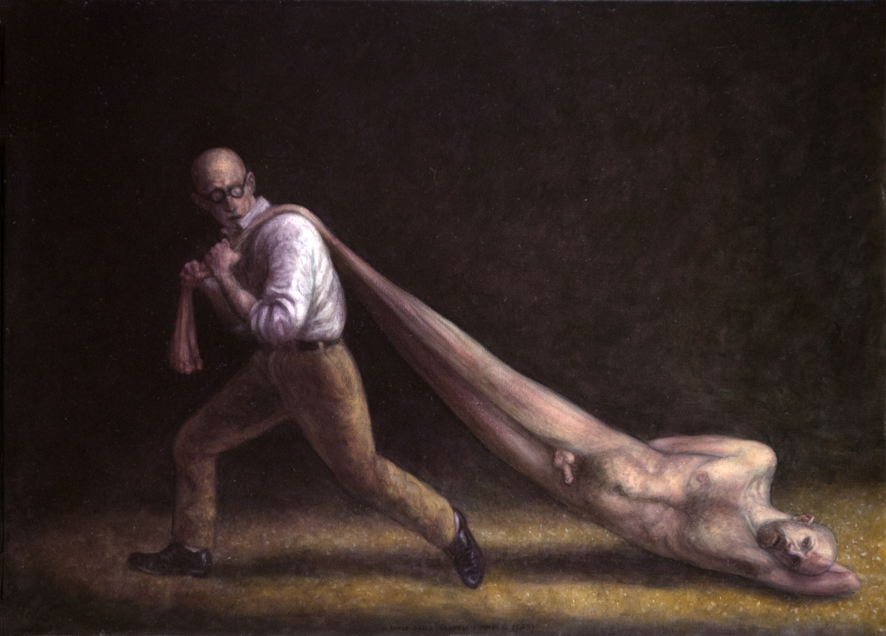 Come Caravaggio – e da lui passando per Goya, Géricault, Delacroix e Bacon – David Dalla Venezia è un pittore del buio. I colori che usa sono pochissimi, la stesura levigata, l’espressività dei soggetti trattenuta e disciplinata da una materia pittorica che rifiuta la granulosità: il buio che l’artista ci propone è un buio metafisico, potenzialmente infinito, amplificato da una resa a tratti iperrealistica del corpo umano. Ed è dentro quel buio che ci spinge a entrare.