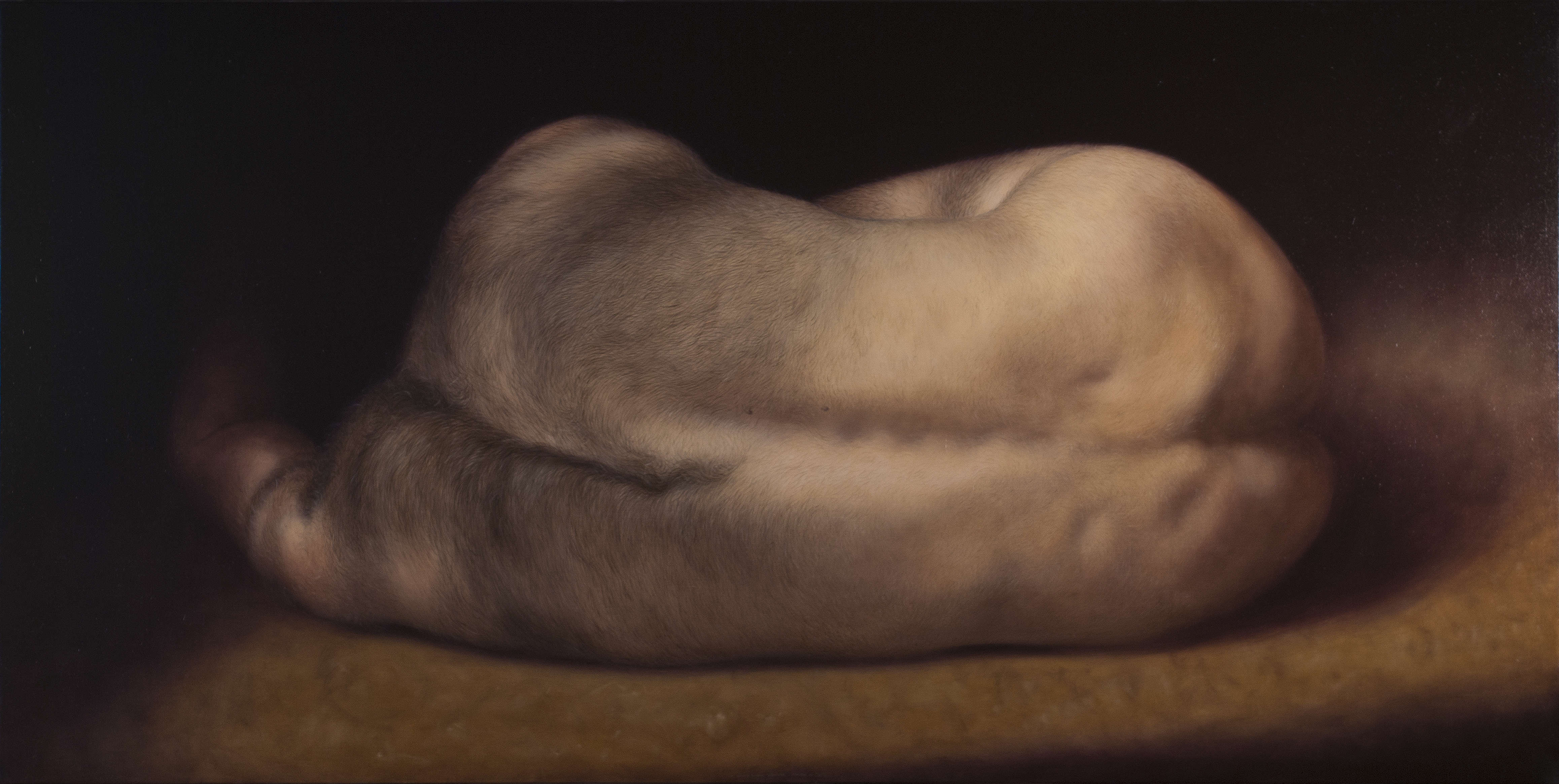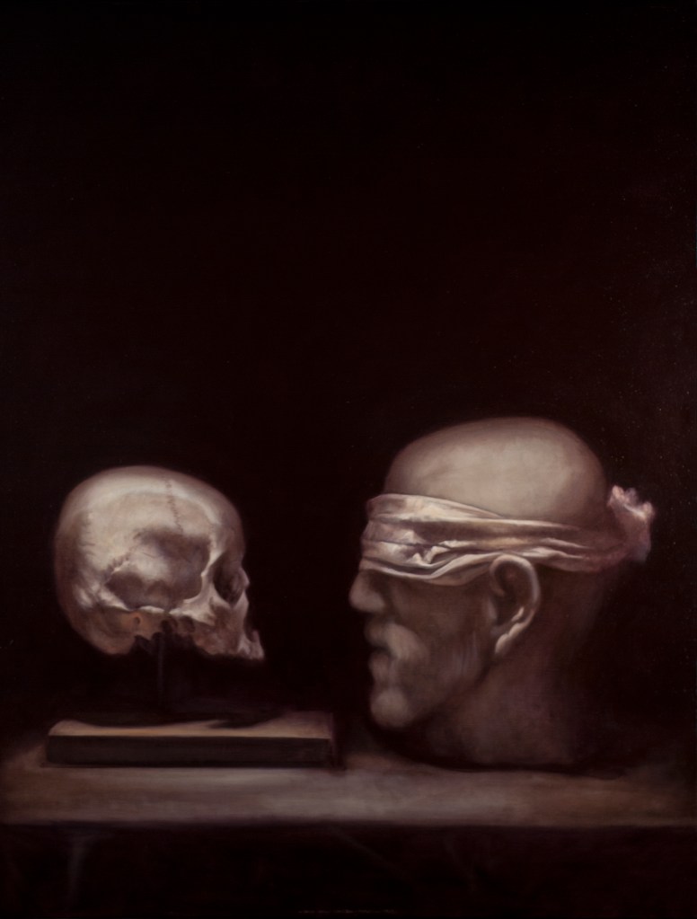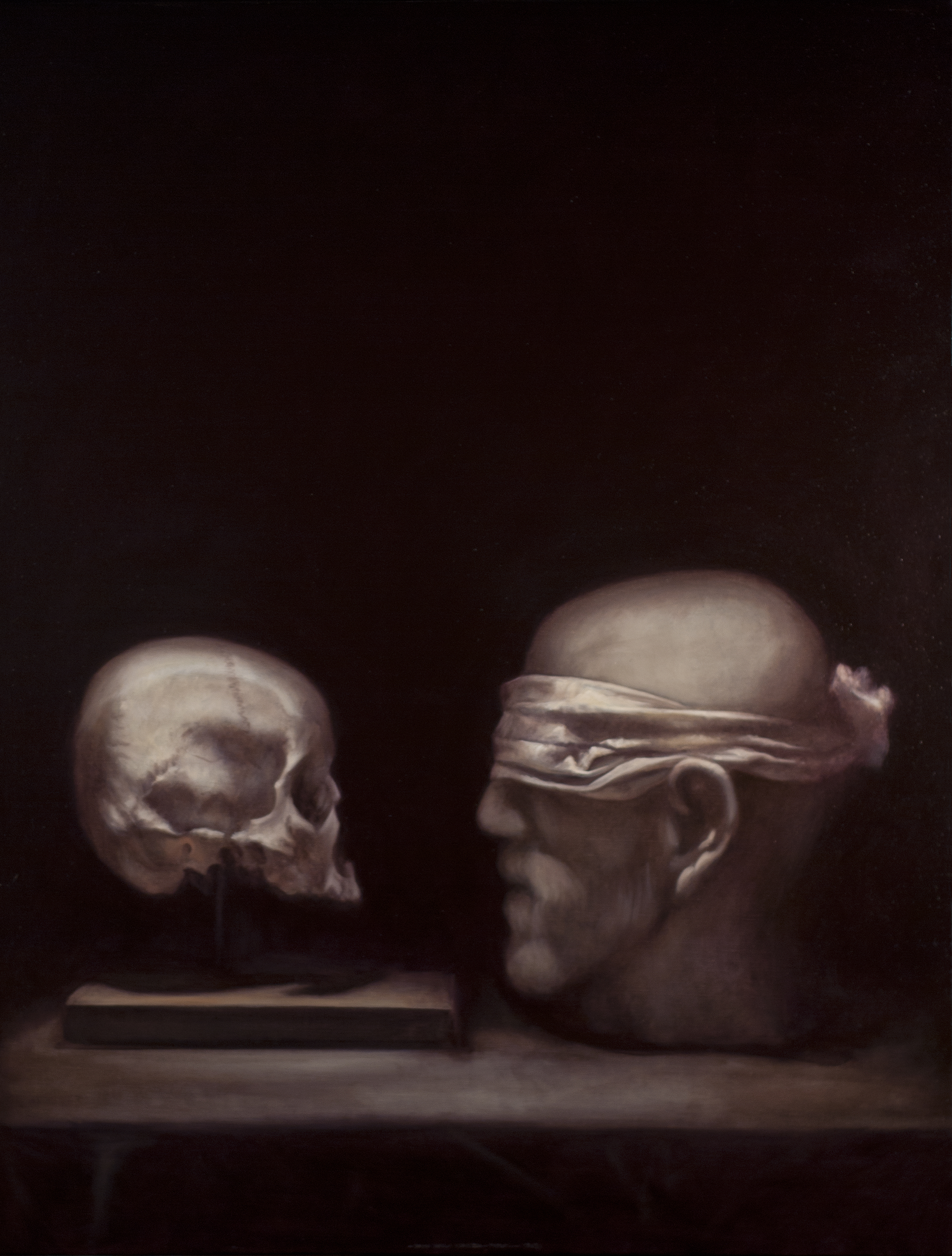 Come Caravaggio – e da lui passando per Goya, Géricault, Delacroix e Bacon – David Dalla Venezia è un pittore del buio. I colori che usa sono pochissimi, la stesura levigata, l’espressività dei soggetti trattenuta e disciplinata da una materia pittorica che rifiuta la granulosità: il buio che l’artista ci propone è un buio metafisico, potenzialmente infinito, amplificato da una resa a tratti iperrealistica del corpo umano. Ed è dentro quel buio che ci spinge a entrare.