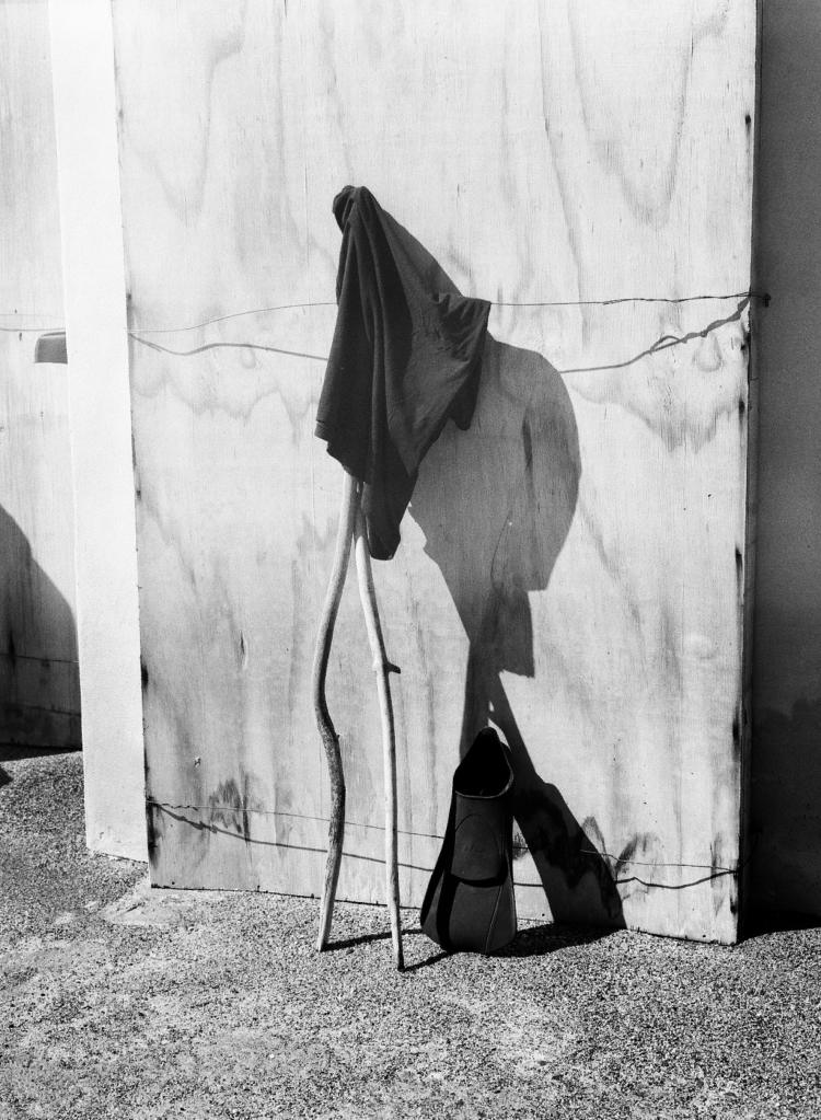 Il paesaggio dà un senso di fissità nel tempo, come se nulla sia mai realmente cambiato da quando le montagne sono emerse dal mare, e lo stesso vale per la tovaglia, che mi piace pensare possa essere una tovaglia generazionale su cui abbiano alloggiato pietanze provenienti da tutti i tempi, in un balletto di cibi fuori da ogni cronologia. Avrà visto famiglie amarsi e litigare, caffellatte sgocciolati da un pezzo di pane inzuppato. L’ombra della tovaglia è la seconda lettera. Le altre tre lettere derivano da magliette e felpe. Una felpa, appesa a testa in giù, genera una sorta di “A” fatta d’ombra. È l’unica lettera intellegibile, in quella strana parola. La “A” è la penultima. Chissà cosa c’è scritto. È una tara degli esseri umani cercare forzatamente poesia anche dove non c’è e, spesso, la risposta più prosaica è quella più vera. Forse, c’è scritto soltanto “ciao”.