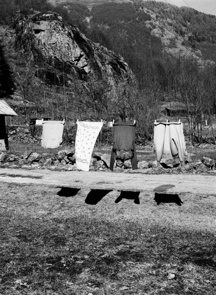 C’è un’immagine che mi racconta una storia. Dei panni stesi su un prato sterminato ai piedi delle montagne, un unico filo tirato a un metro e mezzo da terra: non si vede né il suo inizio né la fine. I panni proiettano un’ombra per terra che sembra una parola di quattro lettere in un alfabeto indecifrabile, roba da archeologi umbratili. Una tovaglia con sopra dei motivi art nouveau genera a terra un’ombra netta, rettangolare, monolitica.