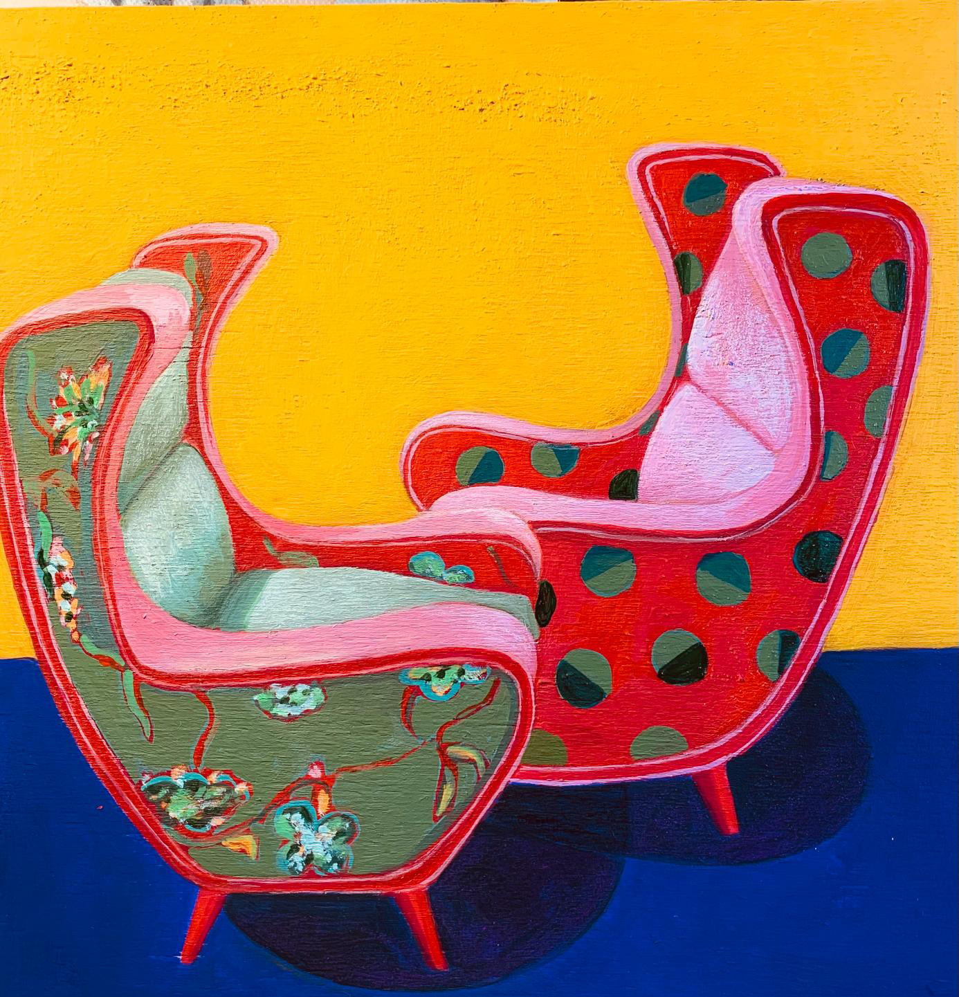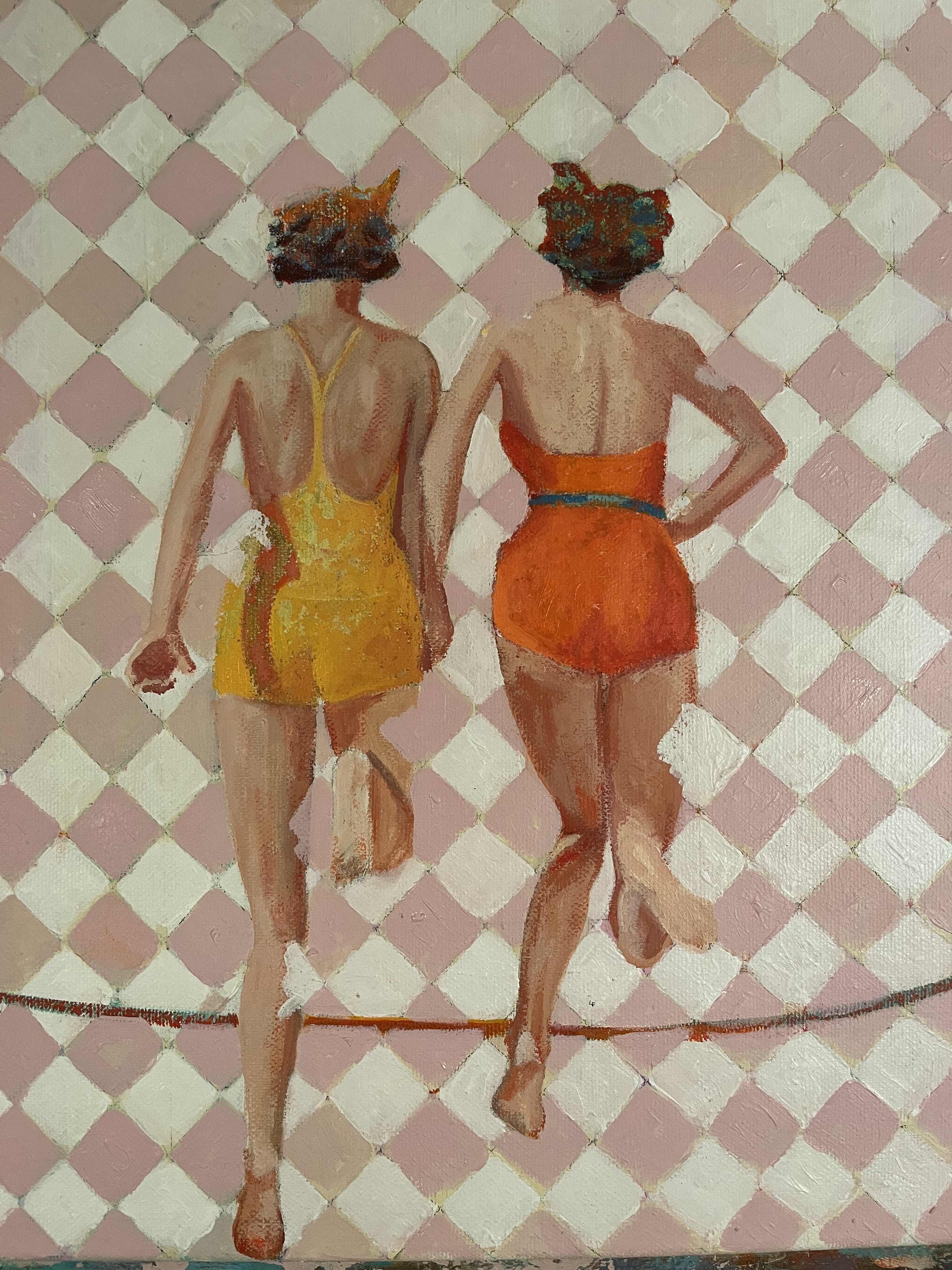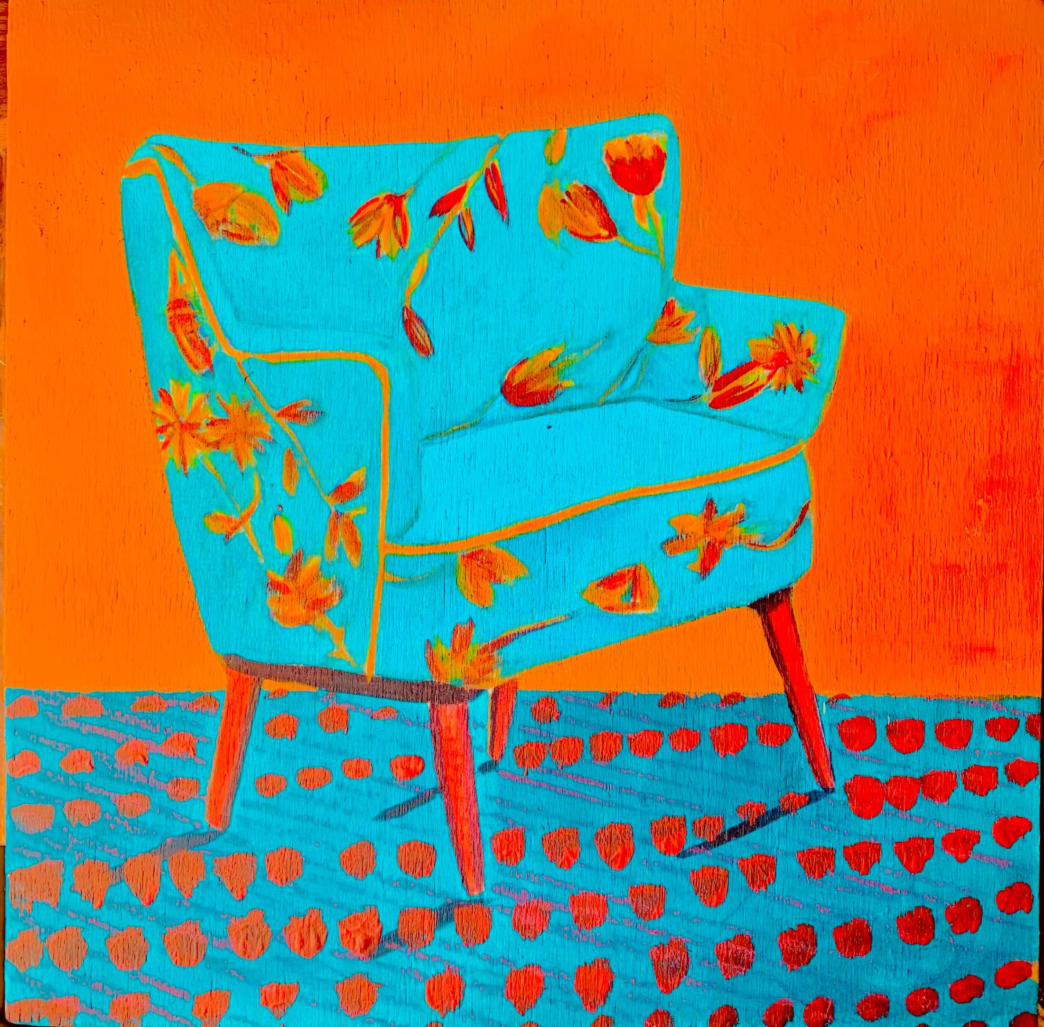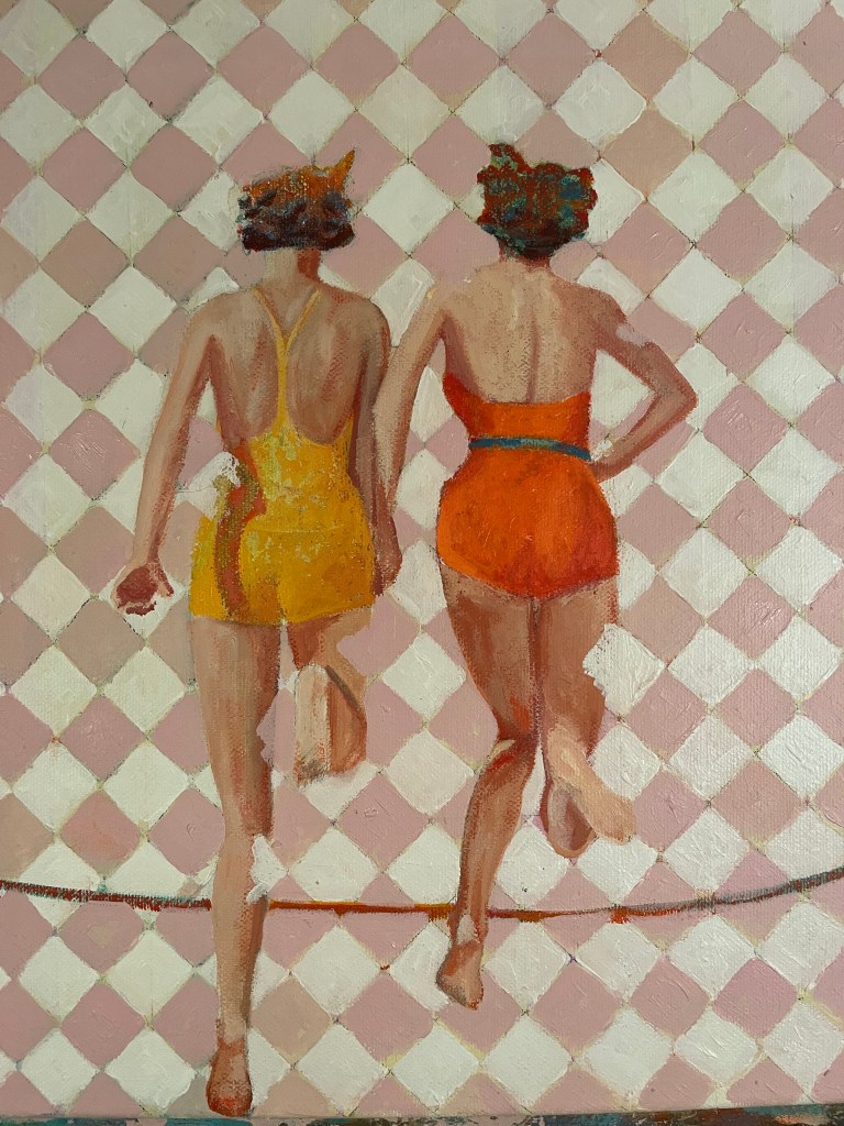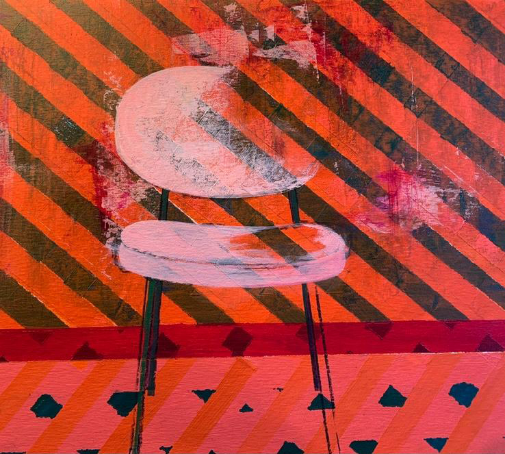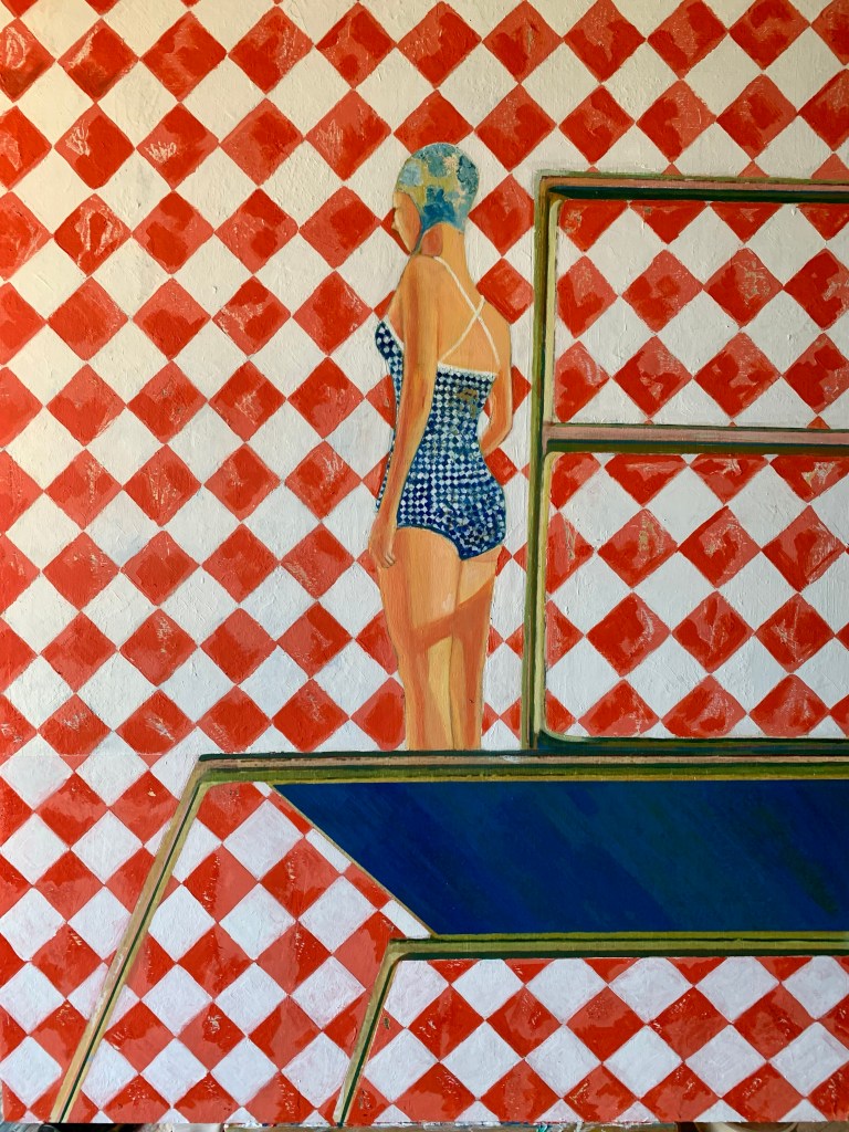 In un primo momento, osservando i lavori di Domitilla Verga, la nostra visione è avvolta dal colore, come se fosse predominante rispetto alla figura. Questa emerge gradualmente all’occhio e sembra conservare un’indecisione: staccarsi dal fondo o restare lì dove l’artista ha voluto collocarla sui materiali di tela, legno, carta, con incursioni nel digitale. In alcuni tratti – brevi, quasi impercettibili – la linea di contorno della figura sparisce come risucchiata dal colore: una sorta di punto di rottura con il definito della composizione. La rigidità delle forme geometriche si attenua, ma dietro l’armonia si inizia a percepire una tensione: le figure umane vengono colte nel momento dello slancio, mentre gli oggetti perdono la loro immobilità in un movimento tensivo generato proprio dalla vivacità e dalla voracità del colore.