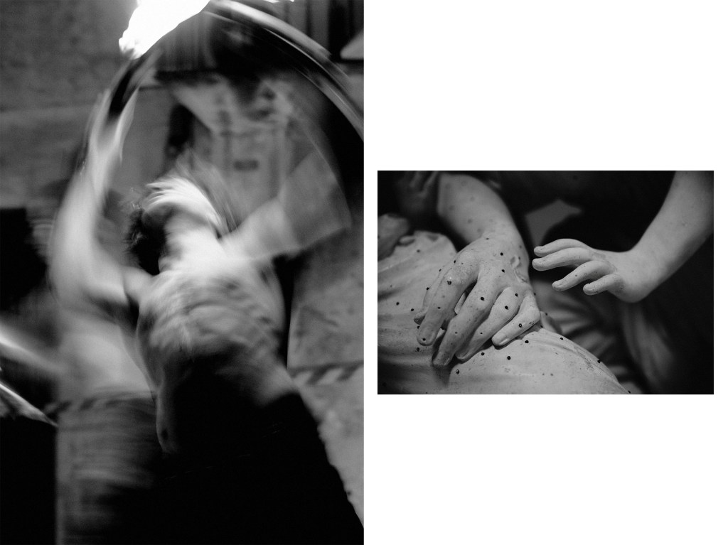 L’uomo è un animale immaginativo che tenta incessantemente di passare dal reale al significativo, che tenta di ricavare dall’intera sua esperienza atti pieni di senso. Sembra questo il movimento, il passaggio, rappresentato nella serie di dittici qui proposti dalla fotografa Debora De Bartolo. Dittici effigiati all’interno con immagini che evocano le condizioni che fanno dell’uomo ciò che egli è: la vulnerabilità, l’abbandono, il contatto, l’erotismo, le inevitabili iniziazioni. L’artista opera sulla necessità di mettere in relazione materia organica e materia inorganica rimarcando quel tramite che nella sua visione è la ricerca formale. È la forma a dare accesso a nuove possibilità di conoscenza anche quando si utilizza l’archetipo. Nella loro combinazione gli elementi aspirano a mutazioni reciproche affinché nulla resti uguale a sé stesso perché nulla lo è, nulla esiste in sé. È così che la verticalità di una figura umana raggiunta da una prospettiva che va dal basso verso l’alto non solo può ricordare quella di un edificio di pietra, ma è quella stessa architettura; una donna eburnea che si curva nell’atto di spogliarsi ricorda o è la spoglia sinuosa di un serpente conservata in una teca; il giro di ali cadute a terra dal volo di un uccello ricorda o sono le ali chiuse di una statua d’angelo.