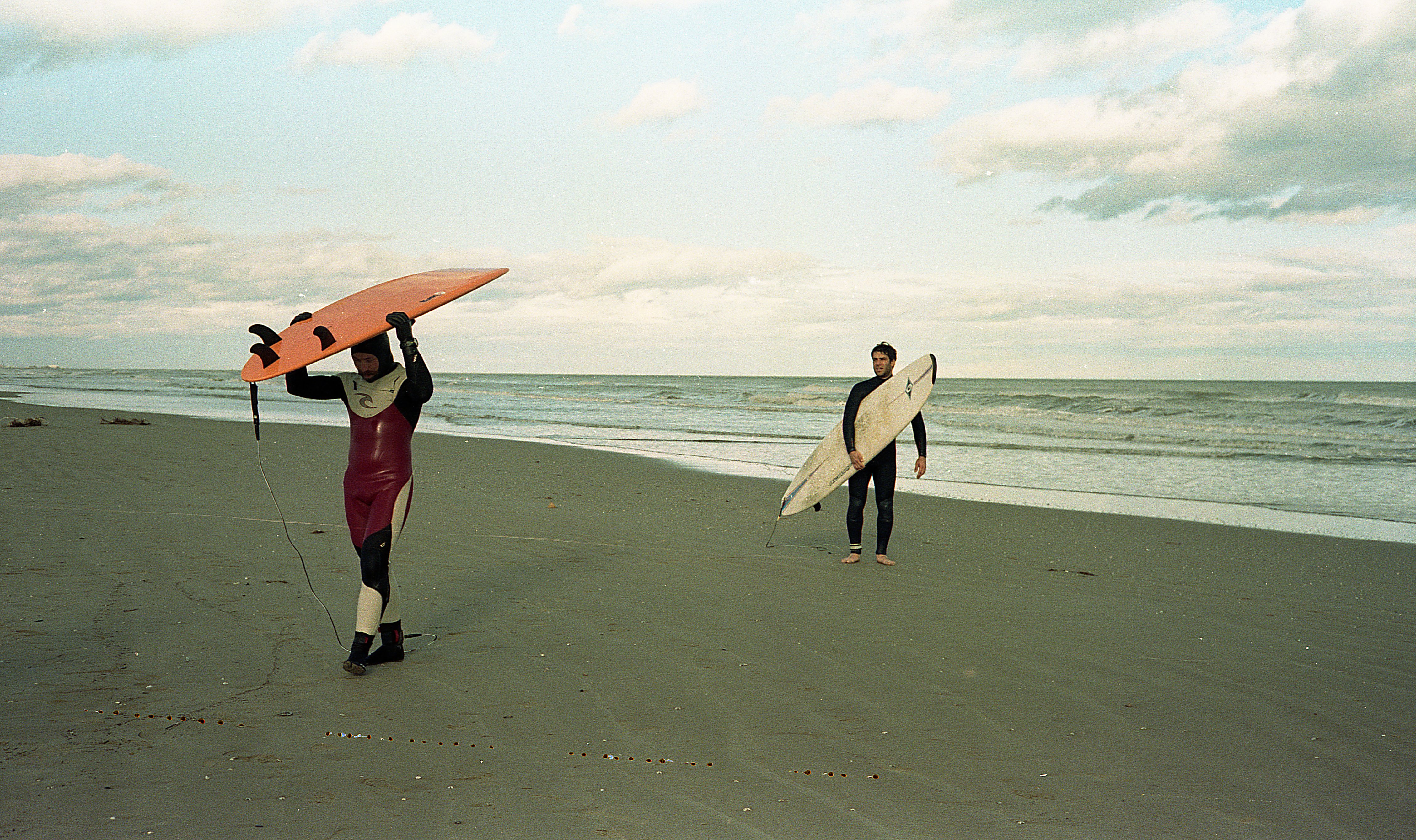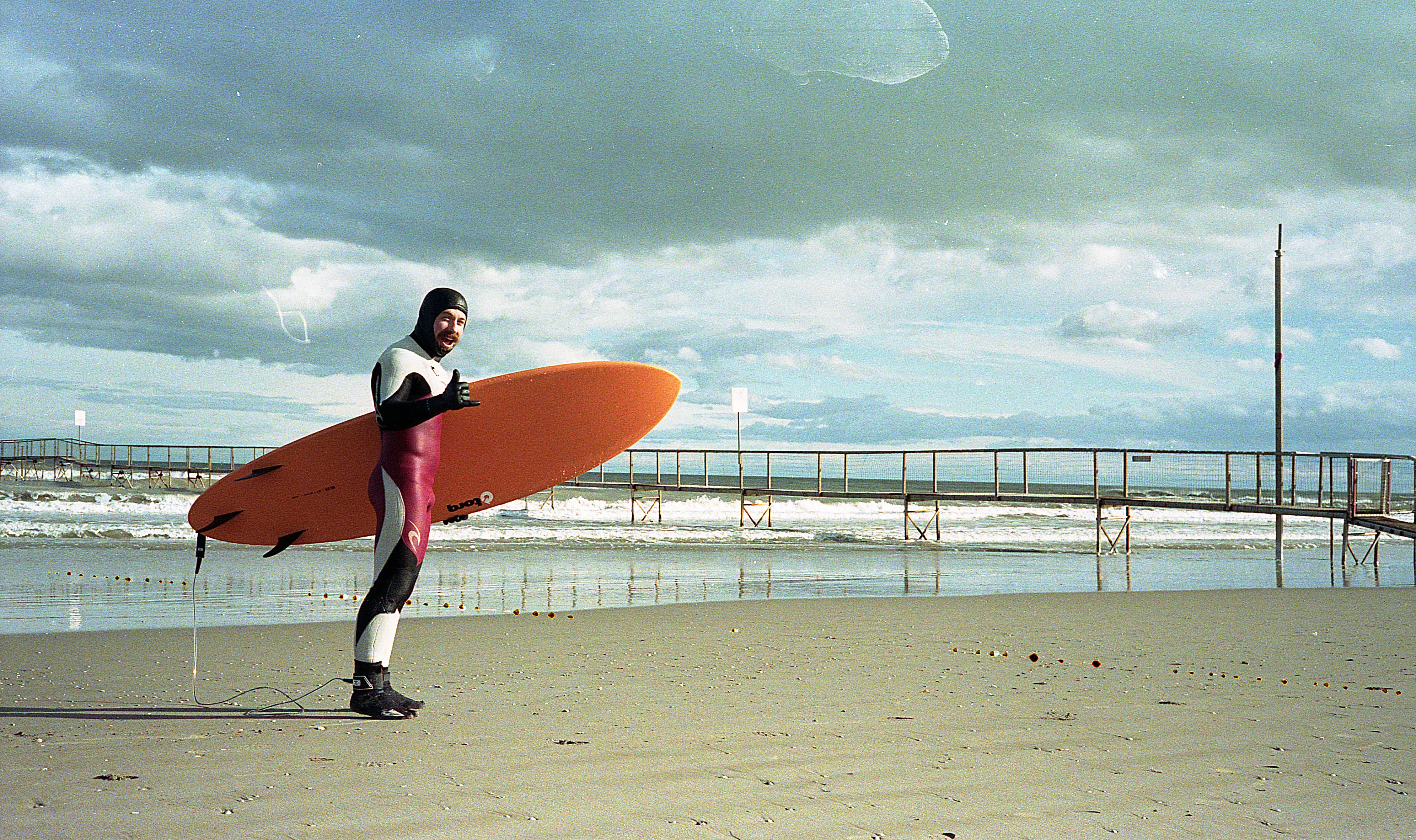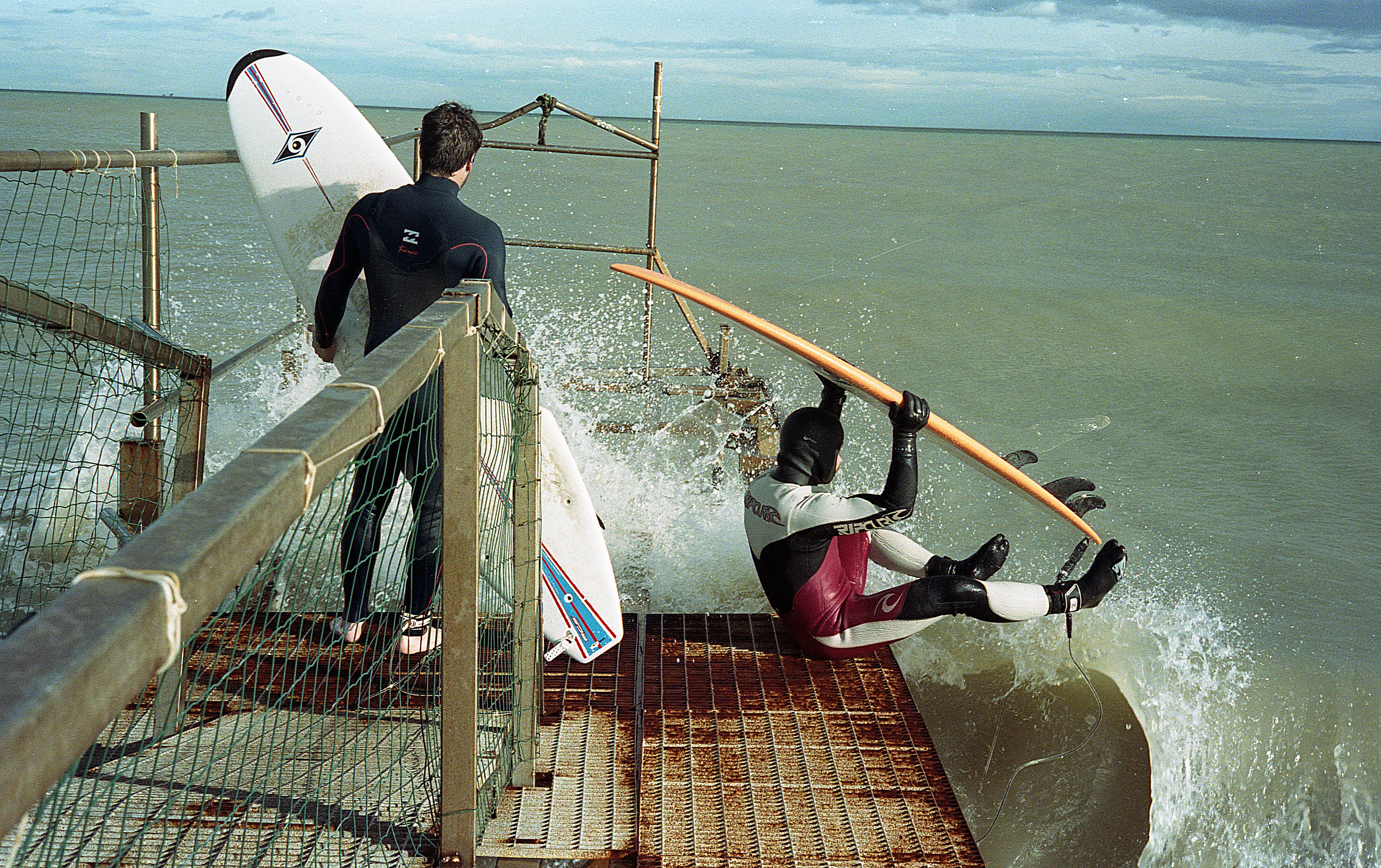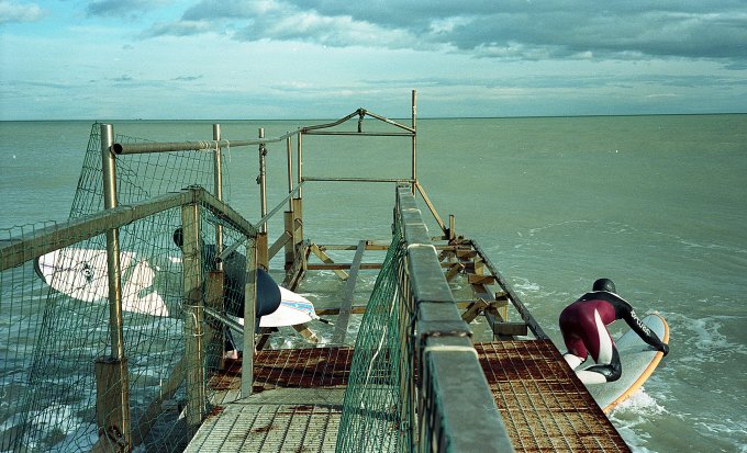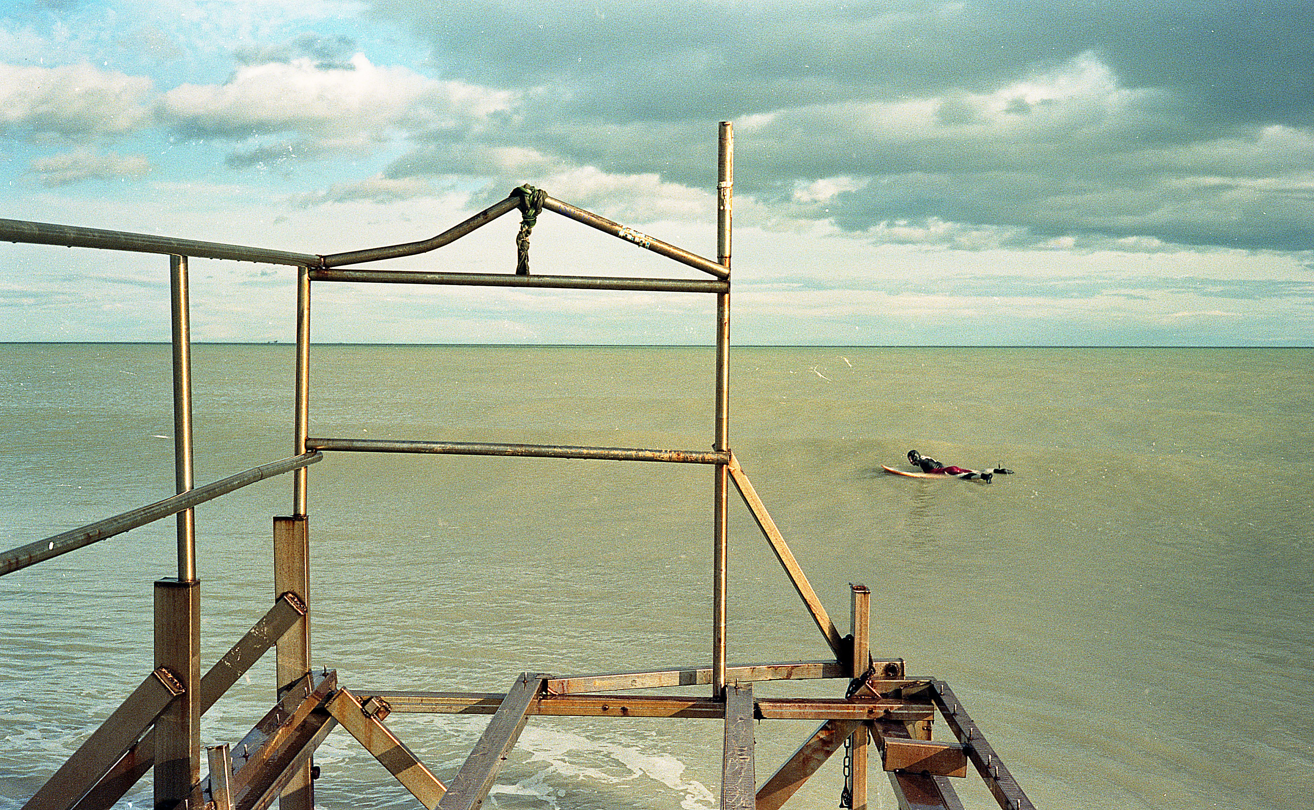 Nella serie fotografica di Roberto De Ruvo il punctum è la linea: oltre al soggetto, oltre al movimento registrato dei corpi l’occhio è attratto dalla ripetizione, dalla scacchiera, dagli elementi geometrici esterni. L’orizzonte è avvertito come spessore; la spiaggia è superficie piana e, assieme alle mute dei surfisti, collabora a un’idea di mondo coperto, stratificato: un mondo di millimetri che si aggiungono alla pelle.