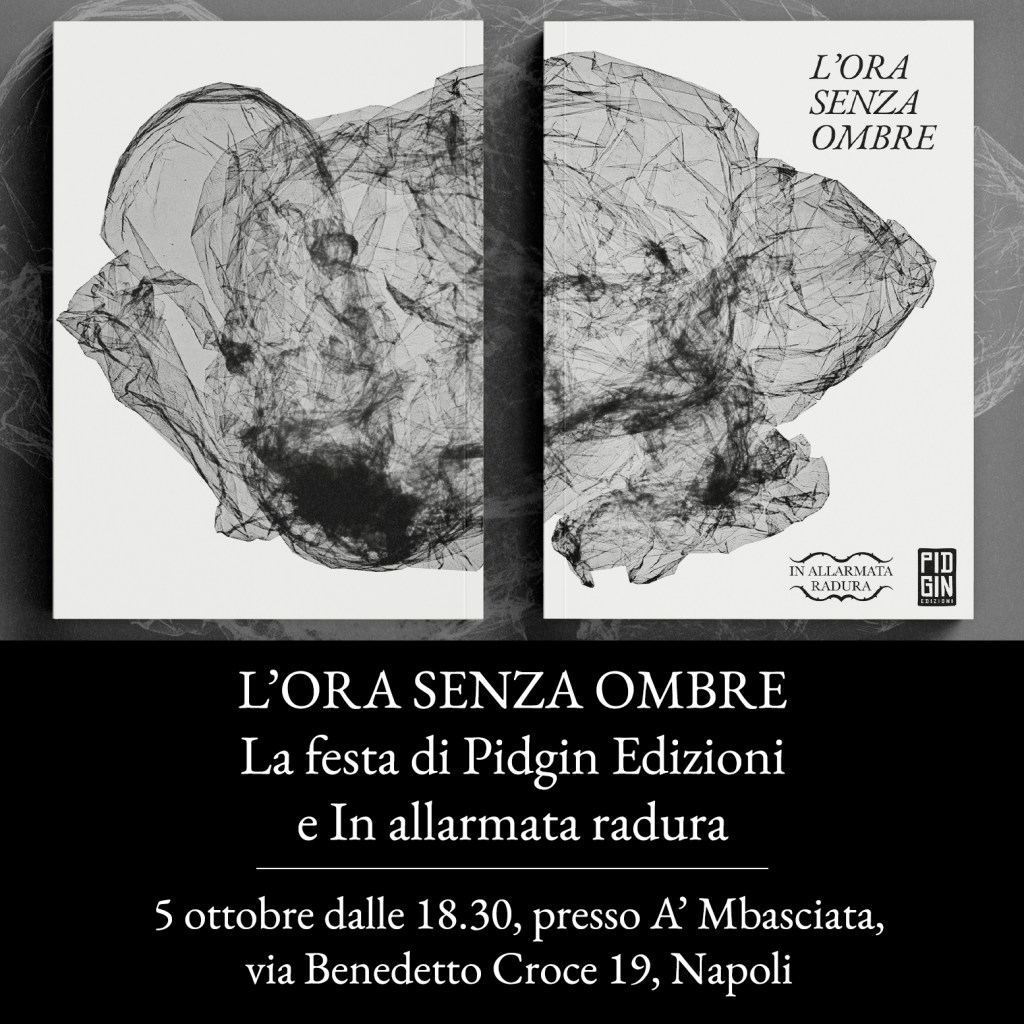 L’ORA SENZA OMBRE. La festa di Pidgin e In allarmata radura. In allarmata radura e Pidgin Edizioni organizzano una festa per il lancio dell’antologia “L’ora senza ombre” presso A’Mbasciata, Napoli, via Benedetto Croce 19 – 5 ottobre 2024, dalle ore 18:30