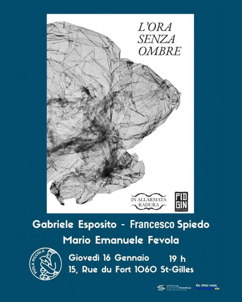 L’ORA SENZA OMBRE. Presentazione. Giovedì 16 gennaio, dalle ore 19:00, saremo alla Piola Piccola di Bruxelles per parlare dell’antologia “L’ora senza ombre” in dialogo con Pamela Frani di Fuoripunto. Saranno presenti gli autori dell’antologia: Gabriele Esposito, Mario Emanuele Fevola, Francesco Spiedo.