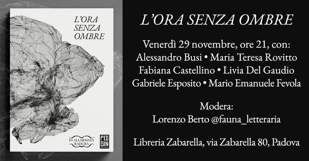 L’ORA SENZA OMBRE. Presentazione. Venerdì 29 novembre 2024, dalle ore 21:00, alla Libreria Zabarella di Padova presenteremo l’antologia “L’ora senza ombre” in dialogo con Lorenzo Berto di Fauna Letteraria. Saranno presenti gli autori dell’antologia: Alessandro Busi, Fabiana Castellino, Livia Del Gaudio, Gabriele Esposito, Mario Emanuele Fevola, Maria Teresa Rovitto.