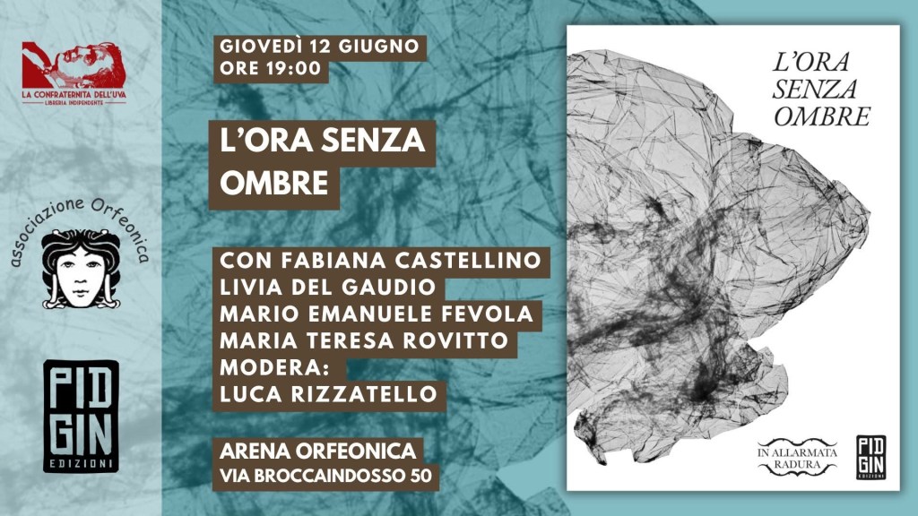 L’ORA SENZA OMBRE. Presentazione. Giovedì 12 giugno 2025 alle ore 19:00, saremo all’Arena Orfeonica di Bologna (via Broccaindosso 50) per parlare dell’antologia “L’ora senza ombre” in dialogo con Luca Rizzatello. Saranno presenti gli autori e curatori dell’antologia: Fabiana Castellino, Livia Del Gaudio, Mario Emanuele Fevola, Maria Teresa Rovitto. L’evento è promosso dall’Associazione Orfeonica in collaborazione con la Libreria indipendente La Confraternita dell’Uva all’interno dell’iniziativa Notti Orfeoniche