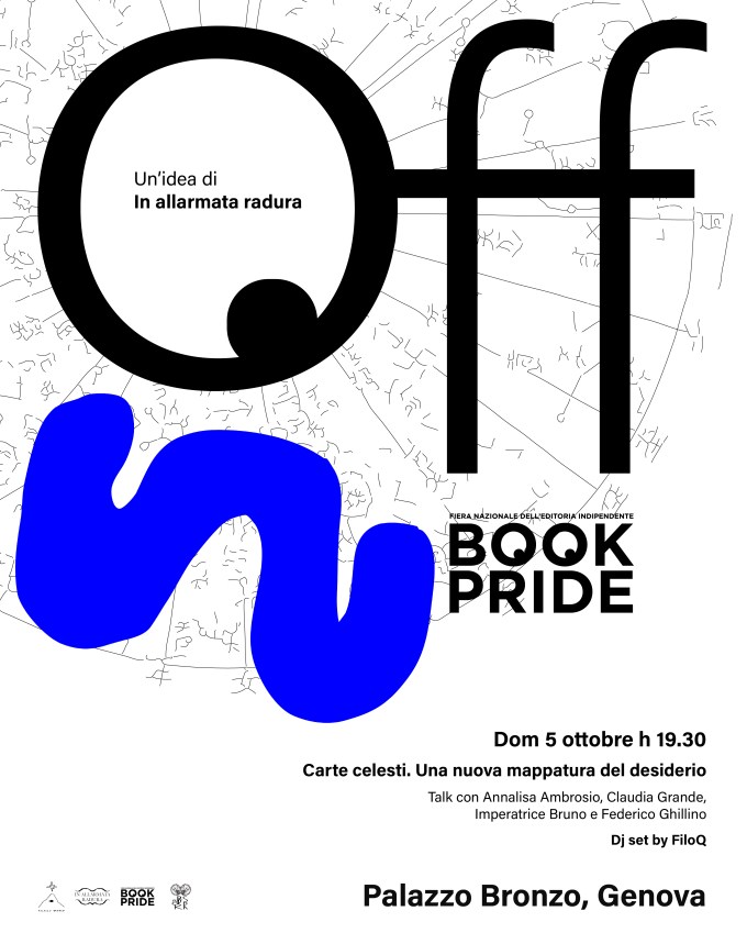 CARTE CELESTI. Un evento OFF di Book Pride: Fiera Nazionale dell’Editoria Indipendente organizzato da In allarmata radura. Domenica 5 ottobre 2025 dalle ore 19:30, saremo a Palazzo Bronzo (Salita di Mascherona 18r – Genova) per un talk + dj set a cura di FiloQ. Saranno presenti gli autori: Annalisa Ambrosio, Imperatrice Bruno, Federico Ghillino, Claudia Grande. A moderare l’incontro: Livia Del Gaudio (In allarmata radura) e Luca Rizzatello (Prufrock spa Edizioni).